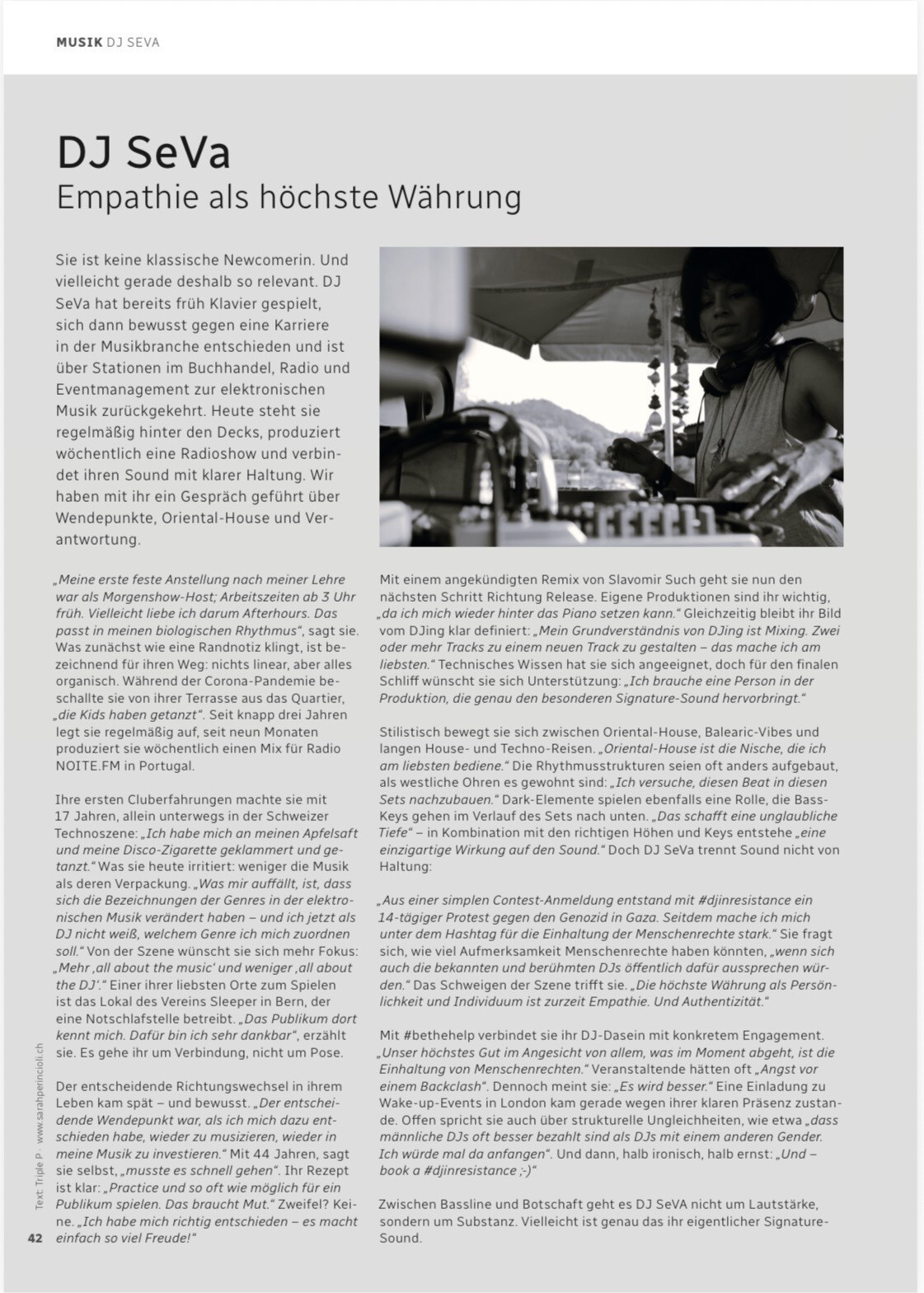 DJ SeVa completed the DJ course for women at Rubinia DJ School in Gaskessel Bern and learned to spin vinyl in 2013. She graduated from the SAE Institute - creative media education in Zurich with a diploma in electronic music production in 2015.